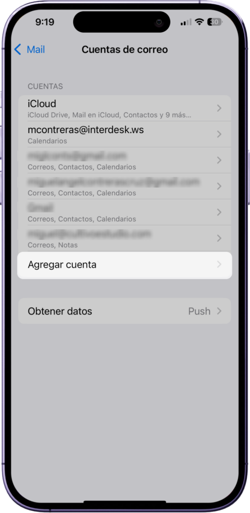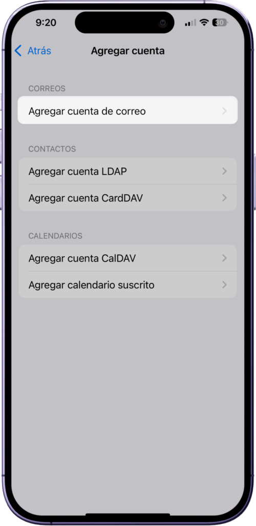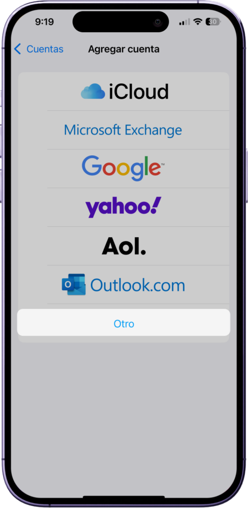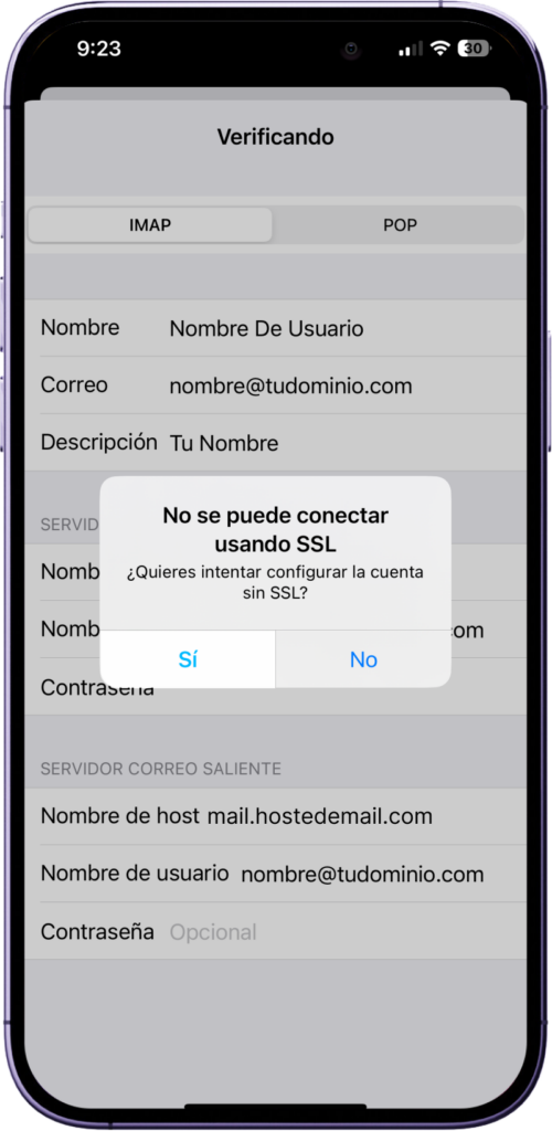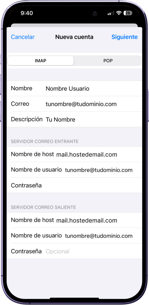 Llenar los datos restantes, los nombres de servidores siempre serán los mismos. El tipo de cuenta será IMAP