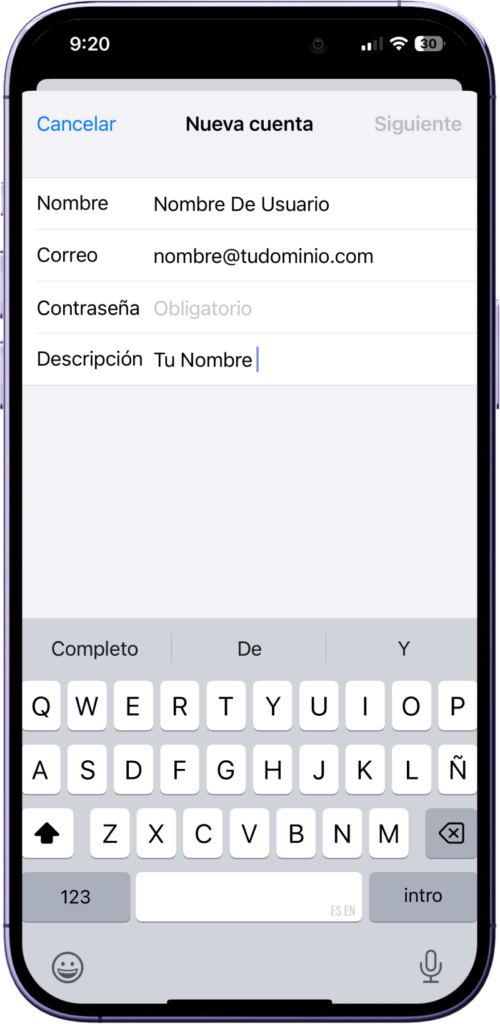 Escribe tu nombre, tu cuenta de correo y tu contraseña y dar tap en siguiente